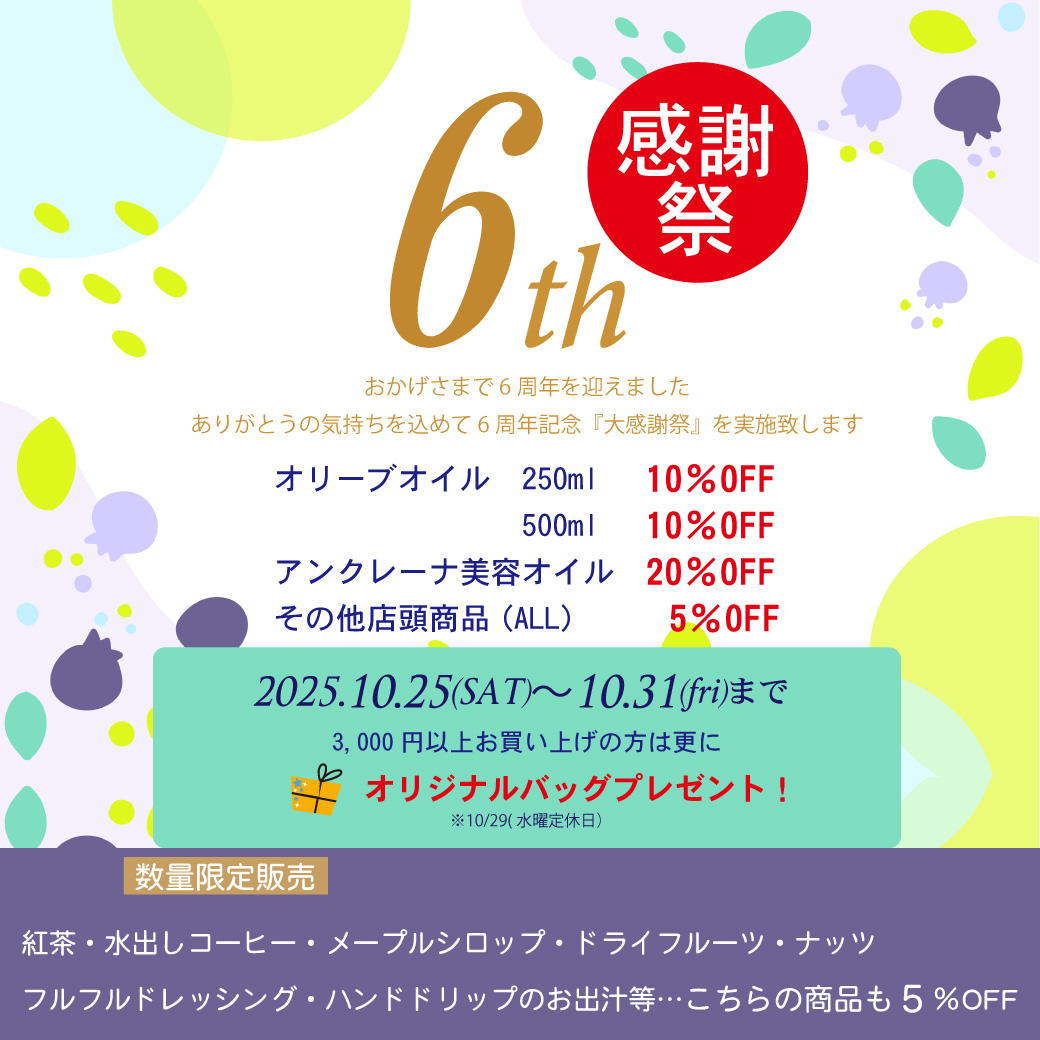 6周年期間中ではございますが、オリーブオイルをたくさんのお客様にご購入いただき、予想を上回るスピードでの完売となりました。